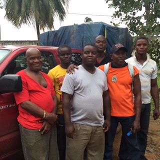 The clinic that we finished almost two years ago now is being staffed by the Ministry of Health.  In addition to birthing the mid-wives have a basic understanding of the health care needs of the people and how to see that they get the medical help that is available.  Dr. Harris, the shorter man in the white tee shirt, is the son of a former bishop of the Lutheran Church in Liberia.  He recently travelled to Liberia and made available to the Kuwaa Mission a pickup load of medical supplies for the clinic.  Due to the condition of the roads at this time of year we were not able to transport them directly to the clinic.  We put a notice on the radio and many people came on a two day 2 day walk from their villages to get the medicines and walked two days back to the clinic.  We praise God for making this possible and the people for their dedication.